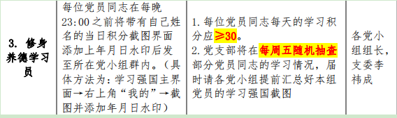 支部全体党员积极响应号召,每日在学习强国app完成30积分的学习,并在各自党小组的微信群内进行打卡,支部每周对各党小组的学习情况进行抽查。