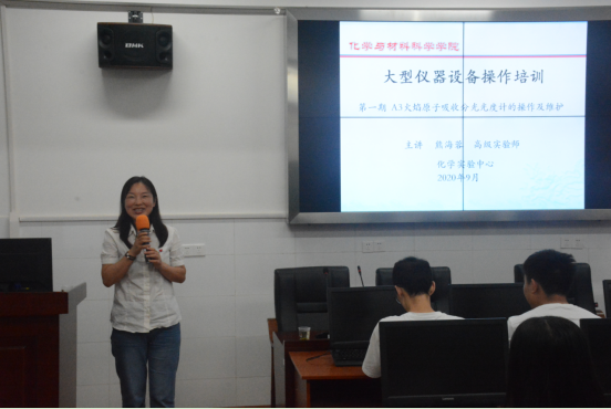 (化材学院 王琼超 熊海蓉)为了进一步促进大型仪器设备共享利用率,充分发挥大型仪器设备在学科建设和科学研究中作用,学校资产与实验室管理处和化学与材料科学学院于9月16日上午在十五教623联合举办了第一期大型仪器操作培训。化学与材料科学学院李辉勇副院长、实验中心喻鹏主任,资产与实验室管理处袁雄科长、王刻铭老师出席了培训会议,全校共50多名师生参加了理论与实操培训。