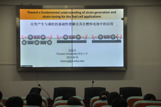 (化材院 邓磊 王亮)9月16日上午,应我院周文新院长与汤剑锋教授邀请,普渡大学曾振华博士在十五教学楼624室作了题为“应变产生与调控的基础性理解及其在燃料电池中的应用”的网络学术报告。报告会由廖桂平副院长主持,李辉勇副院长等领导出席,师生济济一堂。