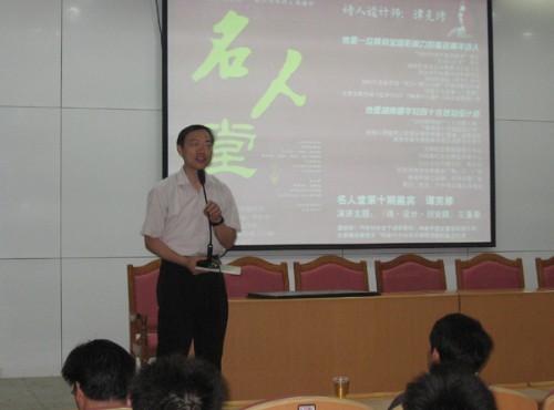 时 间:2007年5月17日晚7:30地 点:湖南农业大学八教国际会议厅主讲嘉宾:谭克修演讲主题:诗·设计·创业路主持致词:湖南农业大学副校长彭克勤教授
