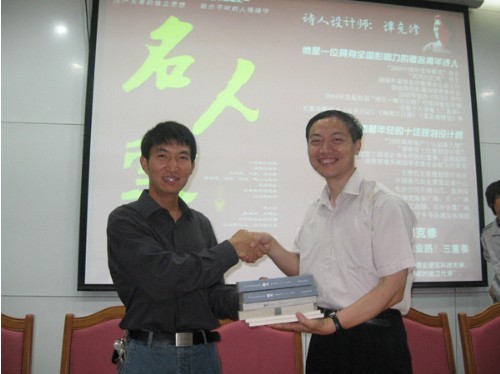主讲嘉宾介绍: 诗人设计师谭克修,70年代年生于湖南隆回,毕业于西安建筑科技大学。大学期间被视为“90年代中间年份学院诗歌的前卫代表”。 他是一位具有全国影响力的著名青年诗人,“2003中国年度诗歌奖”得主,“民间巨匠奖” 得主,湖南作家协会诗歌委员会副主任,参加诗刊社第19届青春诗会,2003年创办《明天》诗刊,2004年发起首届“明天·额尔古纳”中国诗歌双年展,出版个人诗集《三重奏》,主要诗歌作品《还乡日记》《海南六日游》《某县城规划》等。 他是湖南最年轻的十佳规划设计师,被评为“2005湖南地产十大创新人物”,“湖南省十佳规划设计师”,湖南方圆建筑工程设计事务所执行董事、总规划师,湖南省城乡规划学术委员会副主任委员,湖南省城乡规划学会副秘书长、理事,《湖南城市规划》编委,长沙市城市规划学会常务理事,长沙市城市基础设施规划发展协会理事。 主持的主要规划设计项目:中国现代农业博览会展中心等省重点项目详细规划,长沙市同升湖山庄、德润园等大型住宅小区详细规划,长沙市贺龙体育场东广场、五一广场等城市重要景观节点设计,湖南环保工业园、长沙岳麓广场地段等控制性详细规划,隆回、攸县、宁乡等县城总体规划、县域城镇体系规划。 活动总结:五月校园,红红火火,理学院首届“红五月”大学生诗歌节正如火如荼地开展着。5月17日晚,理学院第十期“名人堂”作为大学生诗歌节的主要活动之一,在八教圆形会议厅拉开了序幕。这次讲座的主讲嘉宾是著名诗人、城市设计师——谭克修先生。出席本次活动的有彭克勤副校长,理学院汪建训副书记,湖湘网副总编辑、诗人雪马等。谭克修先生具有双重身份,他是一位具有全国影响力的著名青年诗人,是“中国年度诗歌奖”的得主,同时还获得过“民间巨匠奖”,创办了《明天》诗刊,发起首届“明天·额尔古纳”中国诗歌双年展,出版个人诗集《三重奏》。除外,他又是湖南最年轻的十佳规划设计师,“2005·湖南地产十大创新人物”,方圆建筑工程设计事务所首席设计师,主持设计过农博中心、同升湖山庄、贺龙体育场等数十个项目。 讲座首先由彭克勤副校长致词,他对谭克修先生的光临表示热烈欢迎,并对“名人堂”活动给予了高度评价。彭校长还说他一直关注着“名人堂”的成长并祝愿“名人堂”活动越办越好。接着谭克修先生围绕“诗—设计—创业路”这个主题与同学们进行了深刻的思想交流。他讲述了写诗的经历、作品设计的艰辛以及创业路途的曲折。他形象地描述了大学生知识结构的优化趋向呈“T”字型,大学生应该努力拓宽知识面,同时也要扎实的学好专业知识,专业知识扎根深才能在社会立足,更重要的一点是要富于创造力,才能出特色。讲到设计作品时,谭先生拿出了自己最得意的设计作品之一——长沙滨江文化园效果图,设计中将音乐厅、博物馆、图书馆用“三滴水、三块石头、三本书”的意象进行抽象表达,意图用最简单的形体与要素表达极为复杂的建筑性格,让我们在他的作品中看到了文学与设计的完美结合。 在随后的互动问答环节中,谭克修先生妙语连珠,博得同学们阵阵掌声。在同学们的要求下,谭克修先生朗诵了自己获得“年度诗歌奖”的作品《还乡日记》,作品感情真挚,写出了游子对家乡的深切眷恋。最后谭克修先生向学校图书馆捐赠了他的部分书籍,本次“名人堂”活动也在同学们热烈的掌声中落下了帷幕。 彭克勤副校长致词 讲座 观众 观众提问 赠书 为“名人堂”题字 题字 与工作人员合影 |