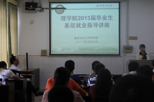 为使广大同学深入了解国家基层就业政策,客观认识基层工作,进一步拓宽学生就业渠道,5月6日下午2:30,理学院2010届信计专业毕业生蒋媛媛回到母校进行基层就业指导讲座,与广大同学分享基层工作经验。讲座由院党总支副书记刘庆华老师主持。蒋媛媛,女,理学院2010届信息与计算科学专业毕业生,中共党员,在校期间曾担任校学生会副主席,多次被评为校三好学生、优秀共青团员。毕业后参与国家西部志愿者计划,于邵东团县委工作。2011年11月至今在湖南省邵阳县白仓镇人民政府担任党政办副主任一职。作为西部计划志愿者期间,被评为“邵阳市优秀共青团员”、“湖南省优秀青年志愿者”。讲座中,蒋媛媛从目前大学生就业现状入手,对西部自愿者计划、报考村官等进行了详尽阐述,呼吁在座毕业生对自己要有清晰的定位,及时掌握国家最新政策;同时也结合自身的基层工作经验与大家进行了交流,给予大家相关的建议,告诫同学们无论在什么工作岗位都要摆正心态,脚踏实地。 (理学院学工组)
