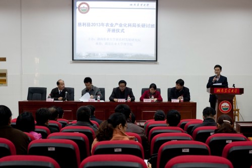 12月2日上午,由慈利县人民政府与湖南农业大学联合举办,我校新农村发展研究院主办、我院承办的慈利县2013农业产业化科局长研讨班开班仪式在老T4举行。易自力副校长、省农业产业化服务局农业产业化指导处处长罗亚明、慈利县副县长陈艳静、学校新农村发展研究院专职副院长金可元、学院院长周文新以及来自于慈利县农办、农业局、畜牧局、林业局、农机局等14个单位的22名学员参加了开班仪式。开班仪式上,学院周文新院长向各位领导和学员的到来表示热烈欢迎,并表示会克服困难,精心组织,为广大学员创造良好的学习、交流环境,争取把这次培训班打造成一个相互学习、增进了解、促进友谊、携手共进的平台。慈利县陈艳静副县长就开班的目的及意义进行了说明,要求研讨班学员遵守纪律,努力学习,注重实效,学有所获。易自立副校长在总结讲话中简要介绍了学校以及学校新农村发展研究院的总体情况,希望学员们珍惜机会,在学习交流中开拓视野,丰富思维,同时希望慈利县与我校加强联系,共同为我省农业产业化发展做贡献。开班仪式后,领导、嘉宾与学员们合影,并开始了第一堂课的学习。本次研讨班是慈利县继上半年在我校举行的农业产业化培训班后的又一重要举措,研讨班学员均为慈利县农业产业化相关单位负责人,12月2日至5日将在我校接受专项培训。培训班邀请了湖南省发改委、湖南省农业产业化服务局、我校相关专家,省内农业产业化相关企业负责人等就农业产业化政策及如何推进农业产业化发展、生态农业发展、土地政策及农民专业组织建设等内容授课。期间还将安排学员参观考察望城国家农业科技园区、长沙都遨农业生产有限公司的休闲农庄,还将赴大通湖考察水产养殖基地、口口香米业公司、锦大渔村等基地和企业。| 点击下载文件: |