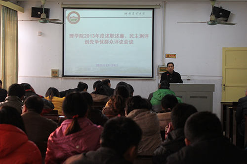 12月19日下午,学院在305会议室举行203年度学院领导班子及领导干部述职述廉、民主测评、创先争优民主评议会议。会议由副校长卢向阳教授主持。学校纪委丑涌萍调研员、组织部王永昌等参加了会议。全体教职员工参加了会议。 卢向阳副校长在会议伊始,代表学院对本次会议的重要性、流程举行了布置,学院邓白平书记代表领导班子就年度工作、党风廉政建设情况、创先争优等情况举行了总结和汇报。随后,学院所有领导一一上台,对本人的工作、廉政建设、创先争优等举行了述职。 最后组织部和纪委现场分发调查问卷,全体教职工对学院领导班子及个人举行了评议。