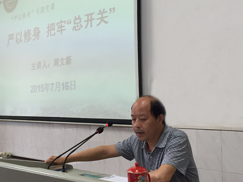 7月16日下午,理学院在三教305会议室举行“严以修身”专题党课。党课由院长周文新主讲,院党委书记邓白平主持。学院领导班子成员、全体教工和学生党员参加了党课。周文新院长以《严以修身,把牢“总开关”》为题,结合学院工作、自身实际,围绕“严以修身”这一主题,就加强党性修养,坚定理想信念,把牢“总开关”做了阐述。党课主要探讨了“严以修身”在“三严三实”中的重要性、正确理解“严以修身”的内涵、为什么要“严以修身”、怎样“严以修身”四个方面。他认为要解决“修身”问题,一是要坚定理想信念,要学习领会马克思主义立场、观点和方法,牢固树立正确的世界观、人生观、价值观;二是要强化理论学习,要把学习作为提升个人领导水平、提高党性修养、坚定理想信念的重要手段;三是要提高党性修养,要自觉地用党的优良作风改造主观世界,使自己具备共产党人的优良品质和美德;四是要保持清醒头脑,首先要着力解决对师生利益不维护不作为的问题,其次要做到警钟常鸣,坚决抵制享乐主义和奢靡之风;五是要敢于担当,要树立担当意识,敢于担当,勇于担当;六是要培养高尚情操,首先要养成学思并重的习惯,其次是要注重道德实践,从小事做起,从身边的事做起。邓白平书记对党课进行了总结。希望学院全体党员能从党课中吸取营养,提高认识,融入工作和生活中。要以“修身”为镜,时常照一照自己的思想,以“修身”为尺,时常量一量自己的行为,为学院深化改革、提高教学科研和社会服务水平贡献力量。| 点击下载文件: |