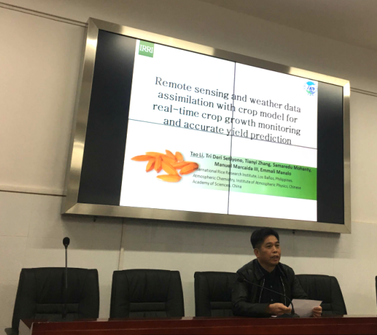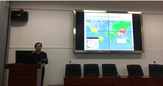 李涛博士从水稻估产对国家决策的重要性以及目前水稻估产存在的问题出发,首先介绍了基于生理过程的水稻生长模型ORYZA的开发历史、ORYZA的功能、输入输出参数及数据库管理,然后讲解了ORYZA对接遥感数据和气象数据预测水稻产量模型参数的调整过程,最后分享了利用遥感数据和气象数据预测水稻产量的案例,并对预测结果进行了检验。报告结束后,李涛博士对师生们的提问做了详细的解答。报告会场,师生们严肃认真,为李涛博士广博的学识所折服。