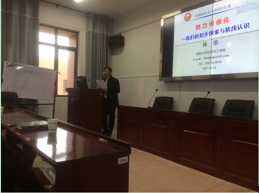 (本网迅 彭昌)2017年12月22日下午,应湖南农业大学理学院周文新院长和彭昌博士的邀请,湖南大学化学化工学院陈浪博士于2017年12月22日来我院以“魅力光催化—我们的初步探索与肤浅认识”为主题开展学术报告。学院100余名师生参加了本次报告会。