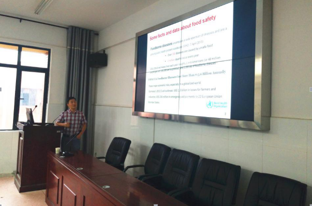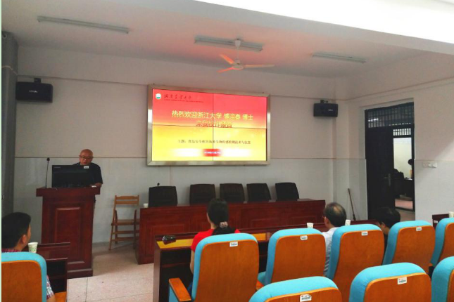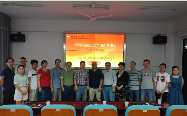 (理学院 苏招红、程永兵)2018年5月26日下午,浙江大学傅迎春副教授应理学院周文新院长和“光电纳米材料与农业环境”课题组邀请来到我院作题为《食品安全相关纳米生物传感检测技术与仪器》的学术报告。本次报告在李辉勇副院长的主持下进行,近百名师生认真聆听了报告。