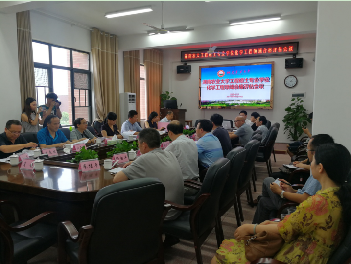 (理学院 桂清文) 2018年6月20日下午,湖南农业大学工程硕士专业学位化学工程领域合格评估会议在我校研究生院401会议室举行。出席此次评估会议的评审专家有湖南大学王玉枝教授、湖南大学尹双凤教授、中南大学刘又年教授、湘潭大学王先友教授、湖南师范大学伏再辉教授、湖南化工研究院柳爱平研究员以及湖南丽臣实业股份有限公司段玉臣高级工程师。我校党委副书记卢向阳教授、研究生院常务副院长郭时印教授及理学院全体领导参加了此次会议。会议由理学院院长周文新教授主持,卢向阳教授致欢迎辞,湖南大学尹双凤教授被一致推荐为专家组组长。