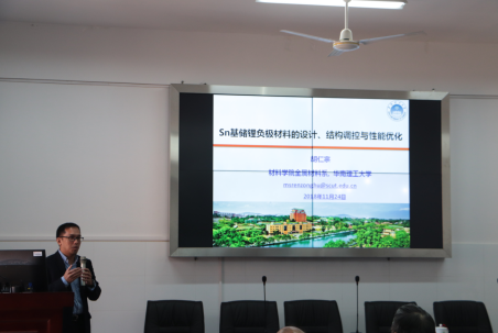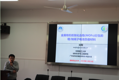 孙立贤教授作了题为“新能源材料与传感器”的学术报告,首先介绍了桂林电子科技大学材料科学与工程学院学科设置及相关支撑条件,然后详细介绍了储氢材料、生物燃料电池、生物传感器等新能源材料与传感器方面的最新研究成果,并寄语农大学子不忘初心、学好本领,祝福农大办学勇创一流、谱写新篇。胡仁宗教授作了题为“先进Sn基储锂负极材料的设计、结构调控与性能优化”的学术报告,他详细介绍了其课题组在新型高比容量储锂电极材料Sn基储锂负极材料方面的最新研究成果,指出了系列Sn基合金与氧化物负极材料成分、微观结构和嵌锂性能之间的关系,及其循环性能、扩散动力学和反应可逆性的改善机制。刘军教授作了题为“金属有机框架化合物(MOFs)衍生的锂/钠离子电池负极材料”的学术报告,详细介绍了利用过渡族金属盐与简单有机酸配体制备MOFs衍生的FeTiO3@C, Co9S8@C, Cu2Se@C, FeP@C等一系列功能金属基化合物的最新研究成果,分享了他在国内外做科研的相关经历和一些趣事,孙教授和两位青年学者严谨的科研思路和丰硕的科学创新成果激起了同学们认真学习基础知识、乐于科研勇于创新的热情。报告结束后,卢向阳副书记向孙立贤教授、刘军教授和胡仁宗教授颁发湖南农业大学“客座教授”聘书,希望继续加强合作与交流。
