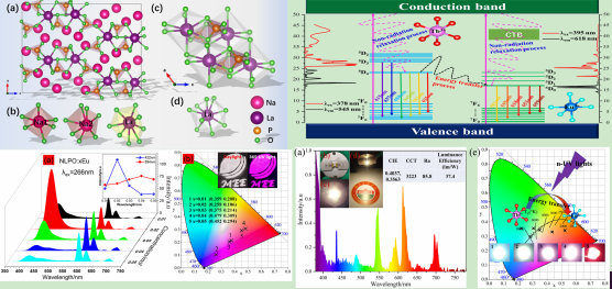 近年来,LED灯由于具有高效节能、环境友好、高的物理化学稳定性和长的使用寿命等特点在室内植物种植领域受到了极大的关注。然而,植物生长灯用荧光粉的量子效率和热稳定性能一直是研究者想要提高的重要参数,本研究着重从缺陷化学角度,利用Li+在Na3La(PO4)2/LaPO4:Eu复相材料中构筑VNa’和VLi’缺陷,以高温激活离子补充热猝灭损失的能量,从能量传递的角度实现荧光粉在150℃高温下保持98.5%发光效率的性能,成为植物生长灯用荧光粉热稳定性能的又一大突破。基于上述研究,作者发现Sr8ZnY(PO4)7基质具备较好的稳定性,通过Tb3+-Eu3+离子的能量传递,实现了暖白光的发射,并展示出高的热稳定性和高的量子效率,同时探索其在植物光学和通用照明两个领域的普适性前景。以上研究成果是MEE课题组在成功申报湖南省光学农业工程技术研究中心后在植物生长LED领域做出的最新研究进展。
