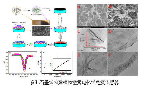 石墨烯自2004年发现以来一直热度不减,拥有着极为优异的导电、导热与机械性能,而通过进步一处理得到的多孔石墨烯较本征石墨烯又有着较大的性能提升。多孔石墨烯的导电性好,比表面积大,可以改善传质和负载效果,进而提高电化学传感器的检测性能。PEAE课题组首次提出化学预还原-电还原法制备多孔石墨烯(ZL201510406071.6),并与金纳米颗粒和IAA抗体进行复合,构建了性能优异的无标记IAA电化学免疫传感器。