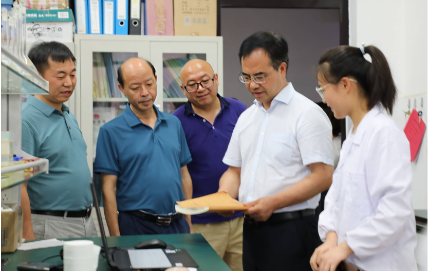 (化材学院 曹瑞、喻鹏)7月7日下午,学校党委书记陈弘带领党政办、宣传部、人事处、发展规划与学科建设处、教务处负责人等一行,赴化学与材料科学学院进行调研。