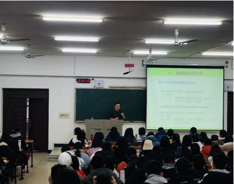 陈树老师主讲《无机及分析化学》中的“酸碱滴定法的应用”这个章节的内容。陈树老师语言生动,对章节内容、知识点的讲解详细,充分利用多媒体将课程理念渗透到教学中。课后,学院教学副院长李辉勇教授指出,陈树老师课堂表现非常优秀,上课思路清晰,讲解生动,语言凝练流畅,能将课本的知识与生活实际相结合。最后,针对陈树老师课堂教学还需要改进的地方,大家进行了交流。