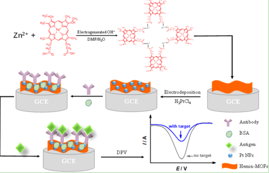 方案1:Hemin-MOF修饰电极和免疫传感器的制备方案。