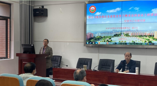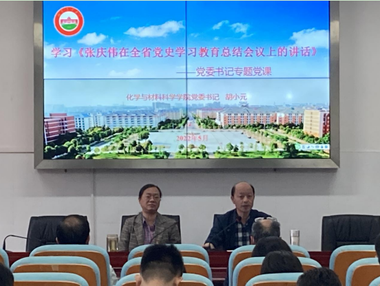 (化材学院 廖渐)学史明理、学史增信、学史崇德、学史力行。5月19日下午,学院党委书记胡小元以学习《张庆伟在全省党史学习教育总结会议上的讲话》为题,在第十五教学楼624为全体师生党员上党课。会议由学院院长周文新主持。