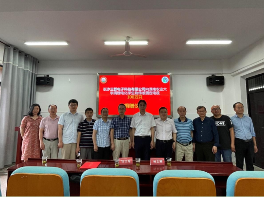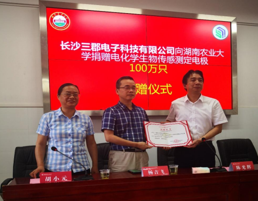 (化材学院 梁鹏程 苏招红)2022年5月31日,在湖南农业大学15教学楼624,举行了“长沙三郡电子科技有限公司向湖南农业大学捐赠电化学生物传感测定电极100万只”捐赠仪式。出席活动的有湖南农业大学党委委员、副校长陈光辉,长沙三郡电子科技有限公司总经理杨吉飞,湖南农业大学校友办主任戴荣四,化学与材料科学学院院长周文新等院领导和老师代表,仪式由化学与材料科学学院书记胡小元主持。