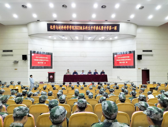 (化材学院 庄淑贤 李杭新)为帮助2022级新生扣好新学期“第一粒扣子”,教育引导广大同学进一步明确新学期目标,以全新的精神面貌投入到新的学习生活中,10月7日上午,我院于大成厅举行学院2022级本科新生开学典礼暨开学第一课,参加本次活动的有院长周文新,党委书记胡小元,正处级组织员张城,副院长廖桂平、李辉勇,党委副书记裴虎,材料科学系副主任苏招红,化学系新进教师郭瑞、王霞,化学实验教学中心主任喻鹏,学工组老师周俊海、庄淑贤,以及2022级全体新生。本次会议由党委副书记裴虎主持。
