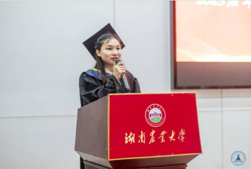 毕业生代表李莉璇回顾了四年的学习生活,她表示,今日的收获离不开自身坚持、集体帮助和老师教诲,毕业后,将牢记八字箴言,在今后的求学之路上继续发光发热。