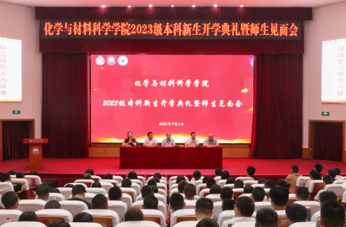 (化材学院 庄淑贤 杨思国)9月4日下午,化学与材料科学学院在修业讲堂举办2023级本科新生开学典礼暨师生见面会。学院全体院领导、各系主任、行政管理人员、新生班主任、全体辅导员及2023级本科新生参会。会议由化材学院党委书记汤帮耀主持。