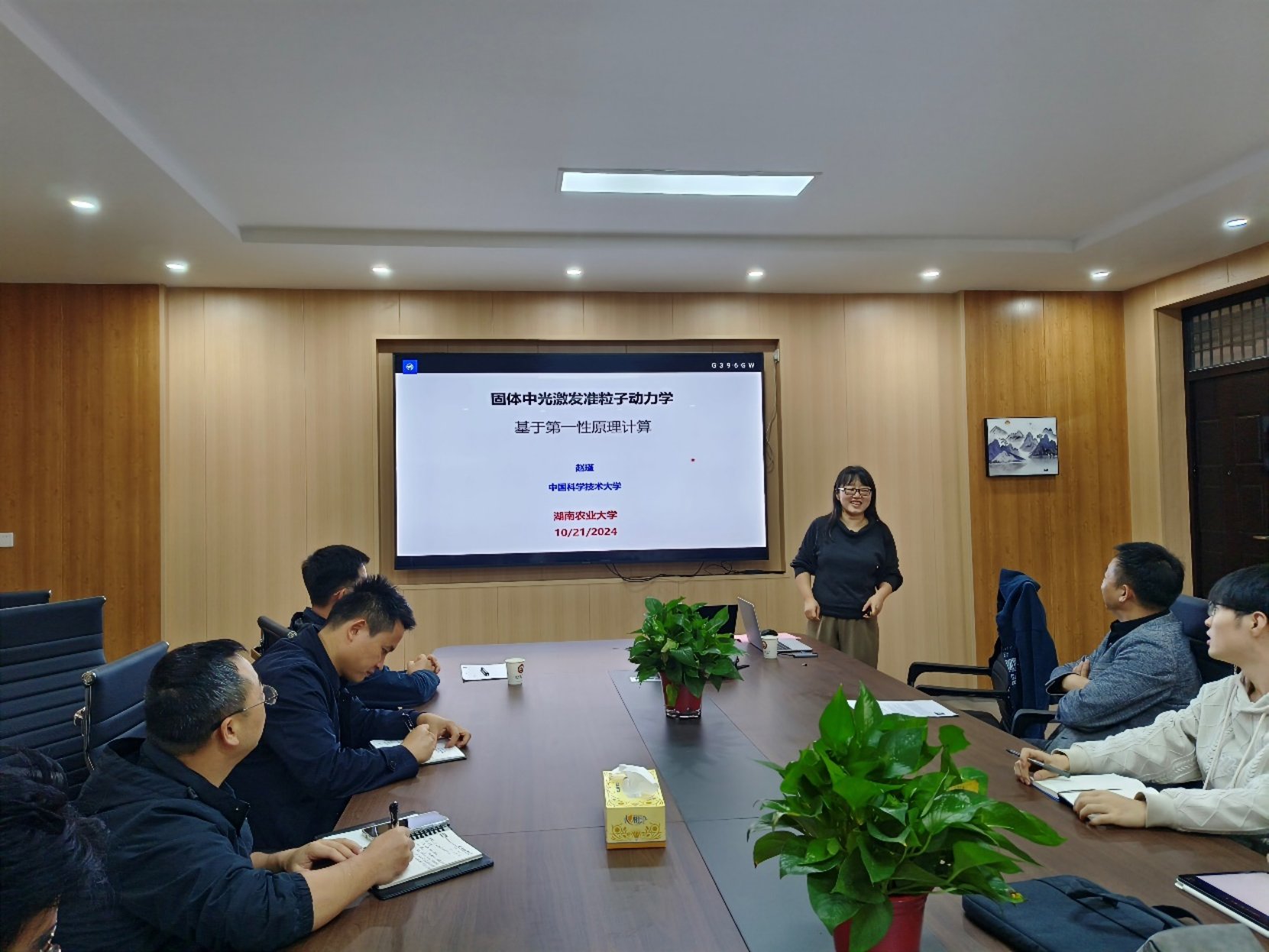 (化材学院 李位)2024年10月21日,国家杰青、中国科学技术大学赵瑾教授到我校进行学术交流,并作了题为“凝聚态体系中的激发态动力学”的学术报告。报告由化学与材料科学学院院长喻鹏教授主持,学院师生代表参加了此次报告。