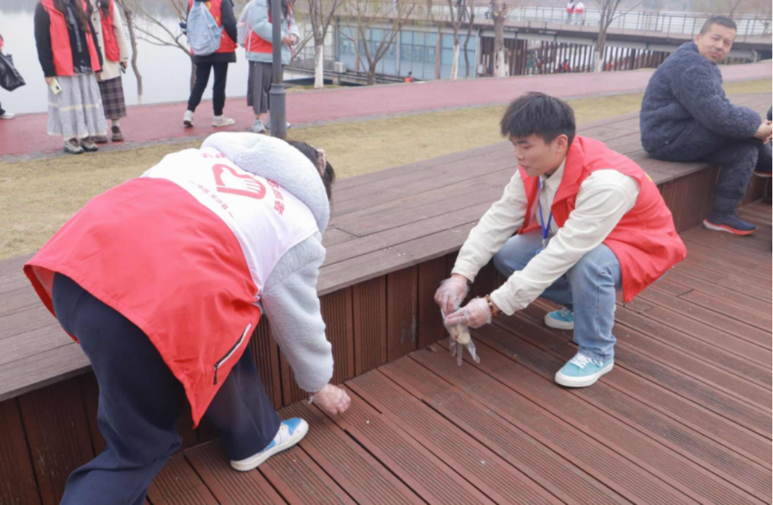 (化材学院 罗若水)3月8日上午,化学与材料科学学院青年志愿者服务队走进松雅湖,开展了一场河流清扫志愿服务活动。此次活动旨在营造“水清、岸绿、景美”的生态环境,吸引了众多志愿者踊跃参与。
