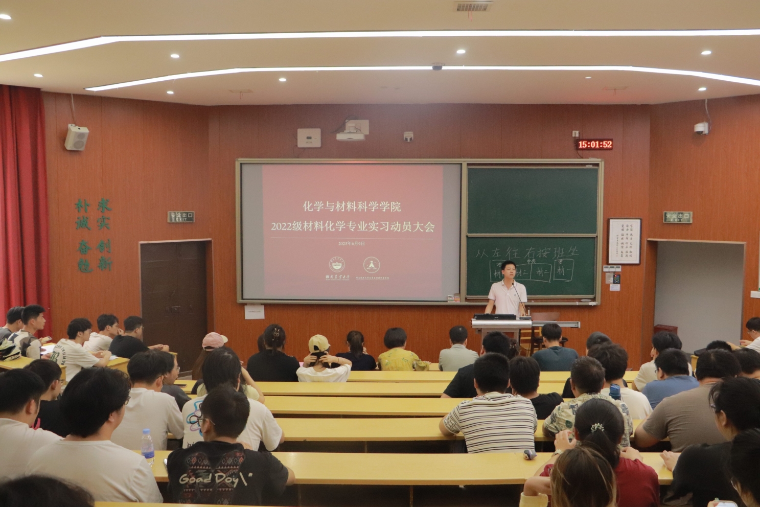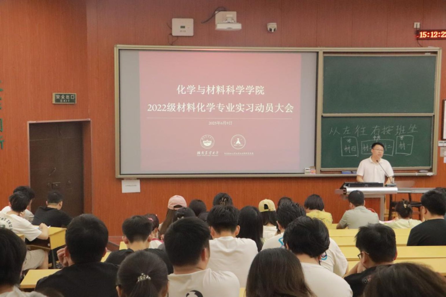 6月9日下午,化学与材料科学学院2022级材料化学专业实习动员大会在第七教学楼新T2教室举行。学院副院长刘辉、院党委副书记余展、材料科学系主任曾宪祥及全体实习指导教师、年级辅导员与专业学生参会,会议由曾宪祥主持。