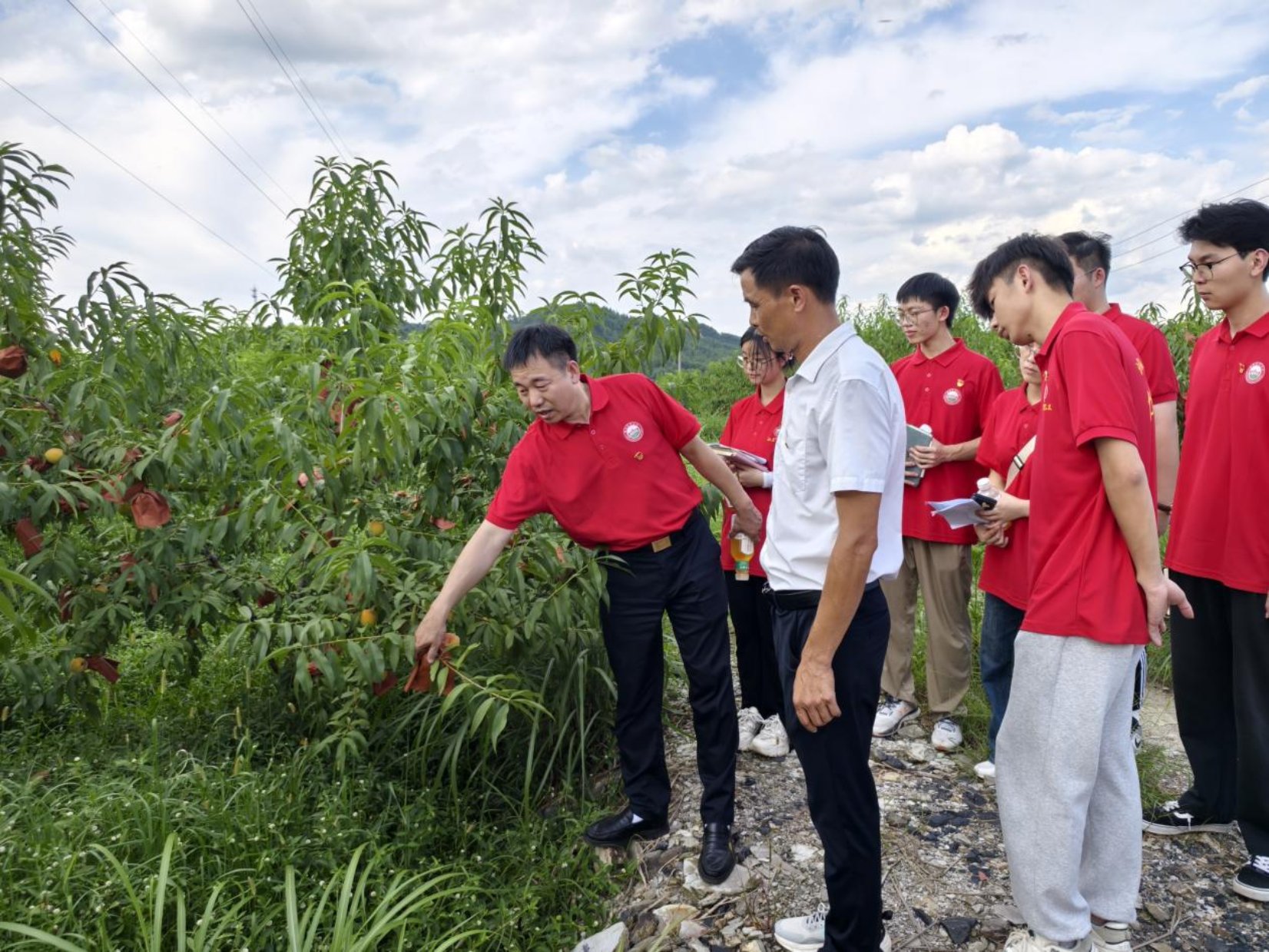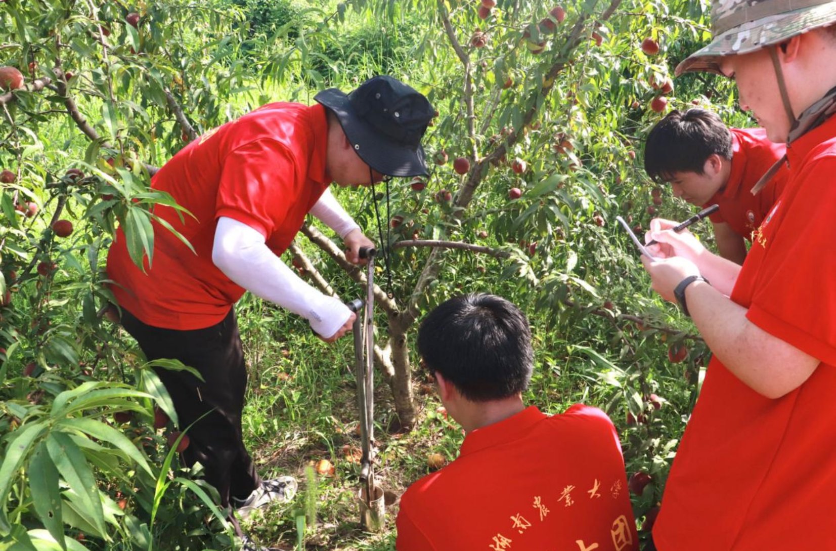“村子里有将近百亩的黄桃园,但由于缺经验缺技术,我们的桃果品质还有待提升,加上销售渠道不通畅,我们的好桃子没办法跟大家分享啊!”黄贻军望着满园的桃树既欢喜又无奈。学院院长喻鹏教授带着同学们下地“把脉”发现,村民们采用的纯天然肥料只能在一定程度上保证桃树的正常生长,桃树旁边的杂草可通过可降解技术转化成肥料,提升土壤质量。另外,近段时间持续的强降雨,加上高温高湿的天气,土地出现了严重的板结,可能导致桃树根系缺氧,吸水吸肥受阻影响生长发育,同学们对桃园的土壤、水质进行取样,带回实验室深度检测后再进行详细指导。