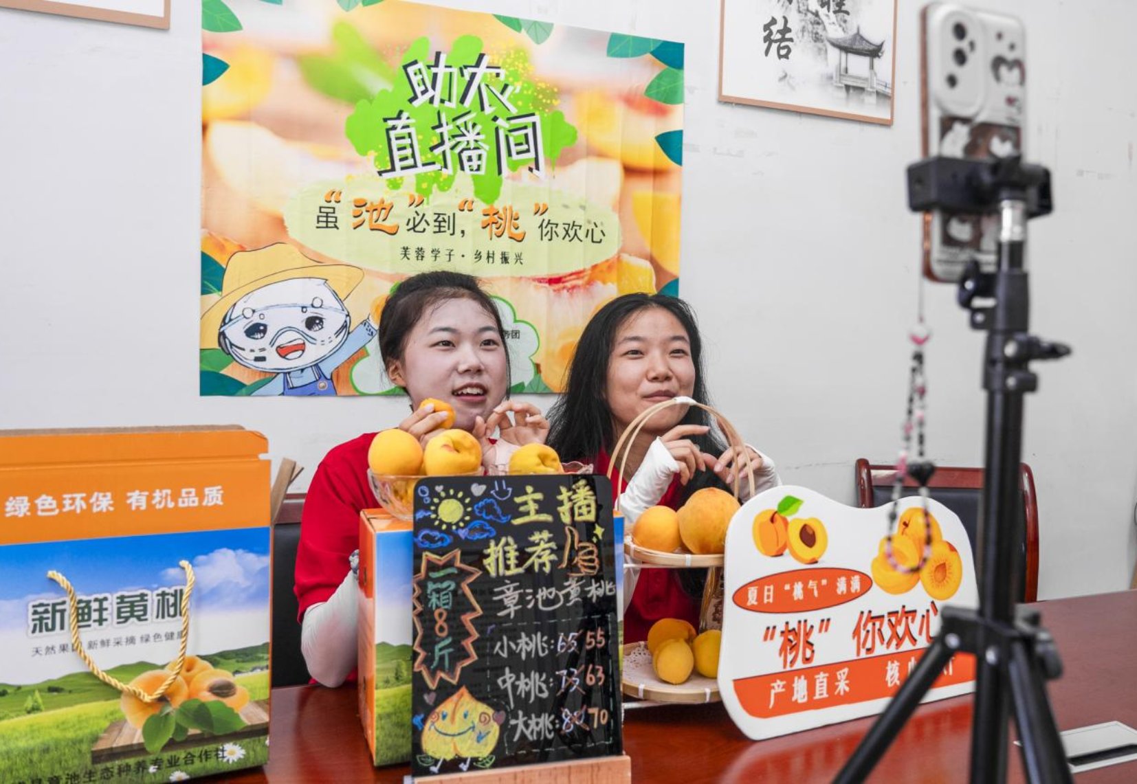 “章池黄桃,甜甜蜜蜜……”镜头前,两位同学正热情地跟网友们介绍黄桃,生动的讲解、有效的互动,吸引着顾客们争先购买,不仅如此,章池村党总支部书记陆勇也加入了同学们的直播队伍,热情地回答着弹幕的各种问题,现场随机拆箱验桃、试吃,三天五场直播,助农直播队伍已经帮忙售出了2000多斤黄桃!直播结束后,同学们还为章池村村干部、章池村种养扶贫专业合作社人员、果农代表等进行电商直播培训,将技术真正交到大家手上;并制作了黄桃宣传手册、设计了黄桃品牌logo,改进了黄桃包装设计,帮助村民拓展多渠道宣传新模式,树立品牌意识,不断做强特色产业。