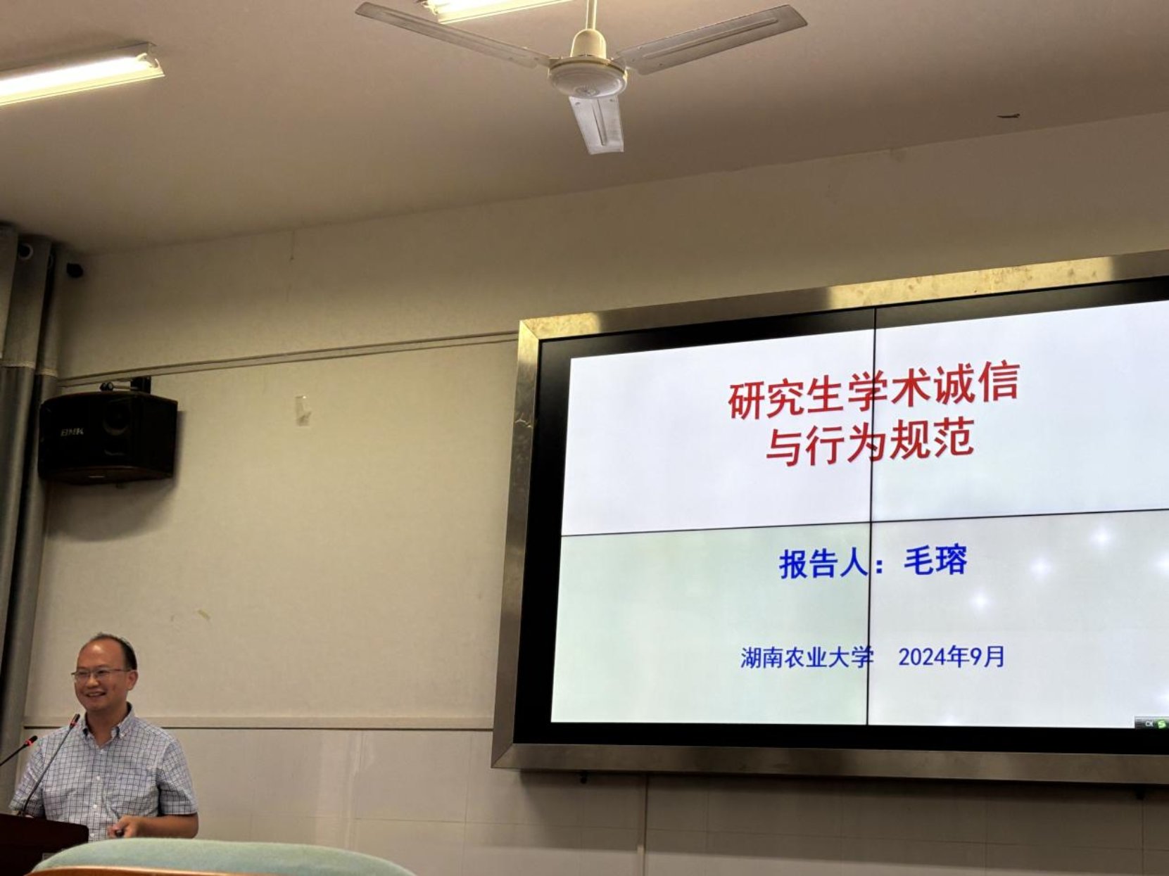 (化材学院 沈佳颖)9月12日,湖南省首批二级教授湘潭大学化学博士生导师王先友教授,江西农业大学林学院副院长毛瑢教授及湘潭大学法学院院长,博士研究生导师欧爱民教授莅临我校作学术报告,三位教授结合各学科,围绕“扣好科研的第一颗扣子——规范学术道德”为报告主题,为24级研究生新生学习生涯指明方向。报告由化学与材料科学学院党委书记兼副院长汤帮耀教授主持,学院师生代表参加了此次报告。