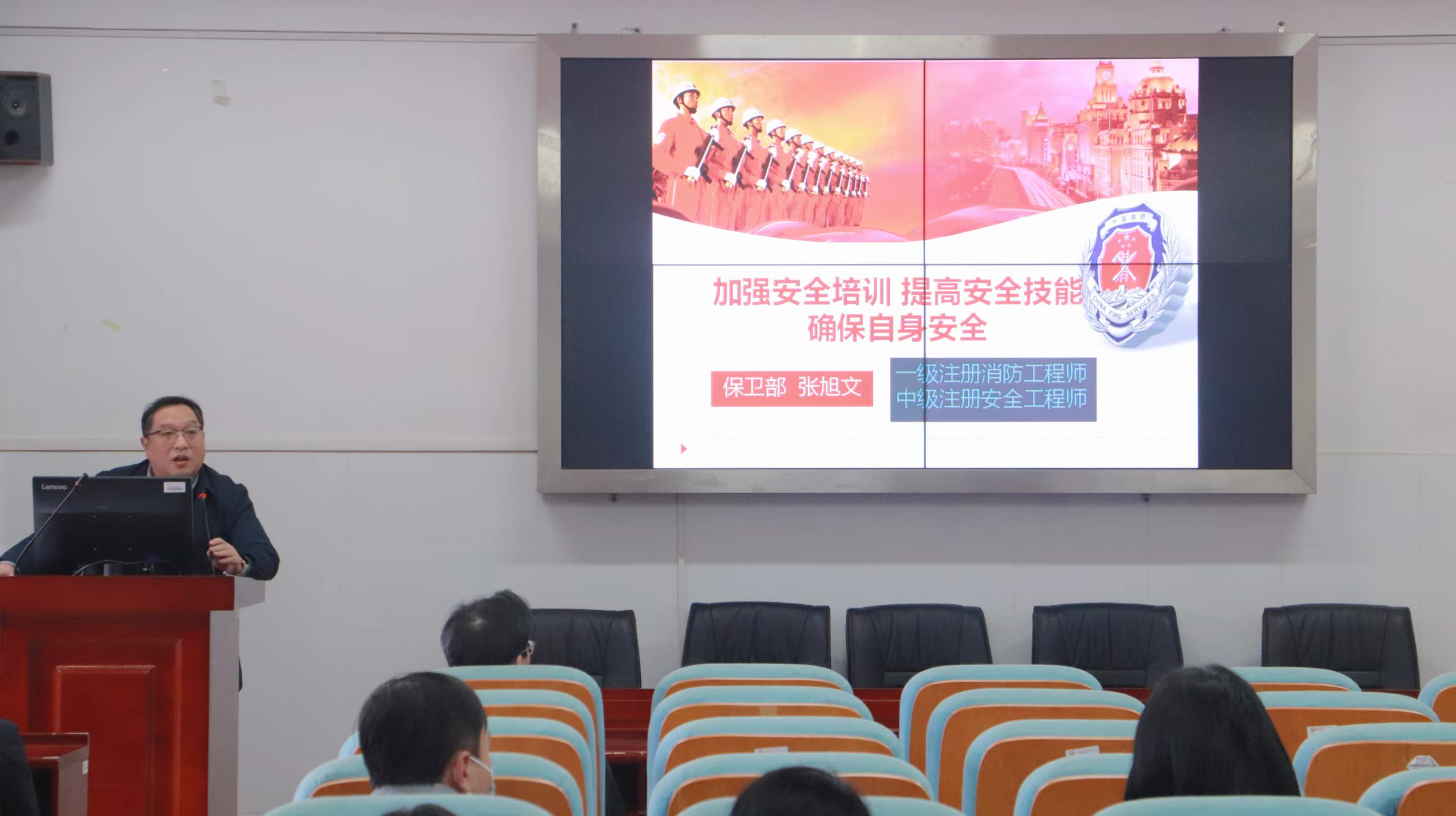 11月20日下午,化学与材料科学学院特邀学校保卫工作部消防科科长张旭文,为学院全体教职工开展了一场消防安全专题教育讲座。讲座由学院党委书记丁凯主持。